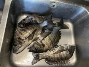 蒲原海岸、黒鯛、メジナ、コバンアジ 2023年10月16日 最終更新日時 : 2023年10月16日 店主 本日のM様が上げた釣果です。中央の魚がコバンアジです。私は初めて見ました。この魚も南方面の魚だそうです。またもや南の魚が増えてきました。