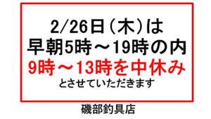 26日(木)営業時間変更のお知らせ 2026年2月25日 最終更新日時 : 2026年2月25日 店主 明日26日(木曜日)は、都合により9時~13時お休みします。お客様にはご迷惑をお掛けしますが、よろしくお願いします。