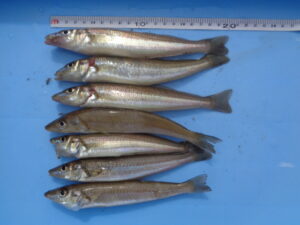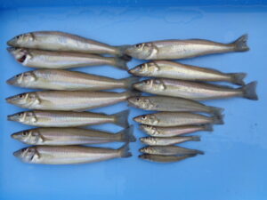 昨日(1月8日)、Sファミリー様のカタボシイワシ、カタクチイワシ、サッパになります。写真の中に3種いますが、97%カタボシイワシです。全部で100匹いました。真ん中の大きいのは23cmもありました。